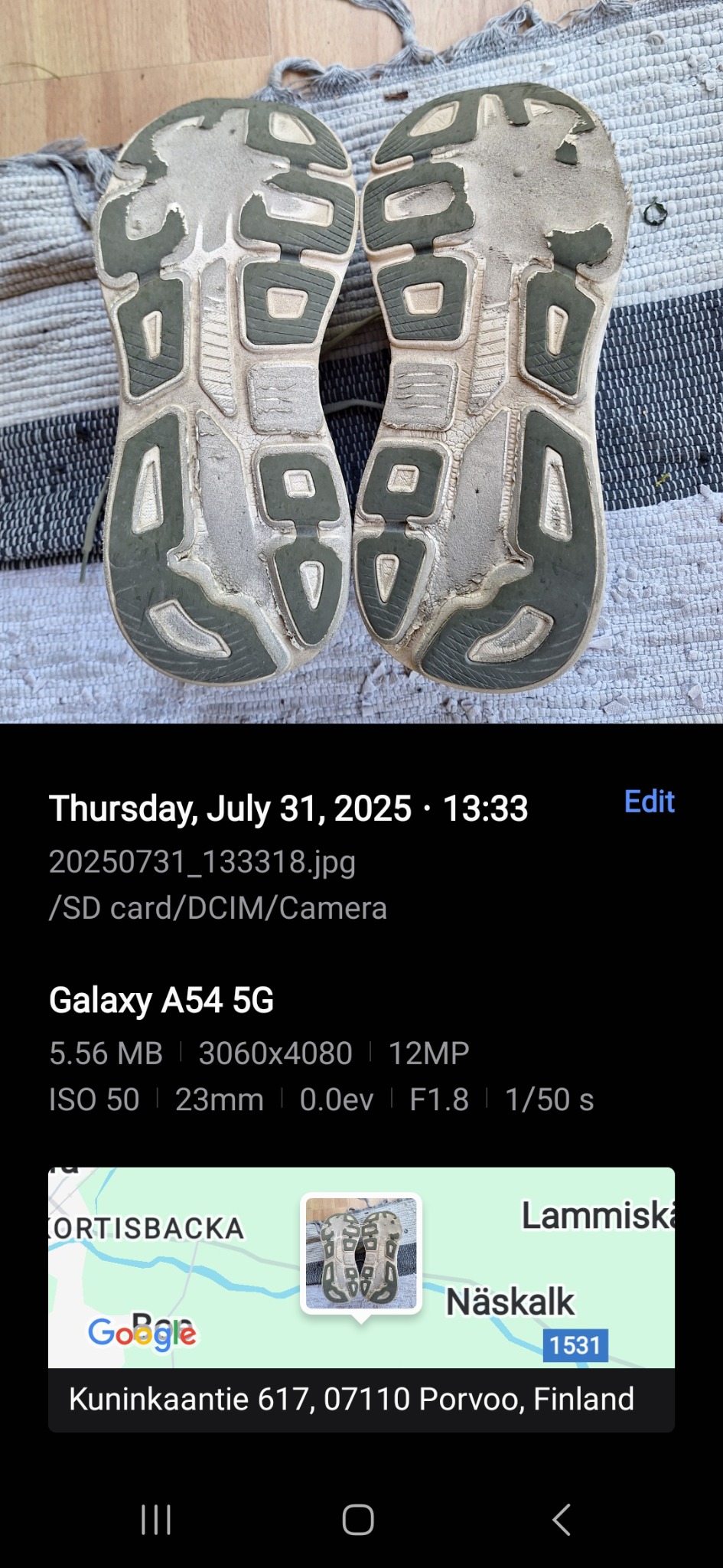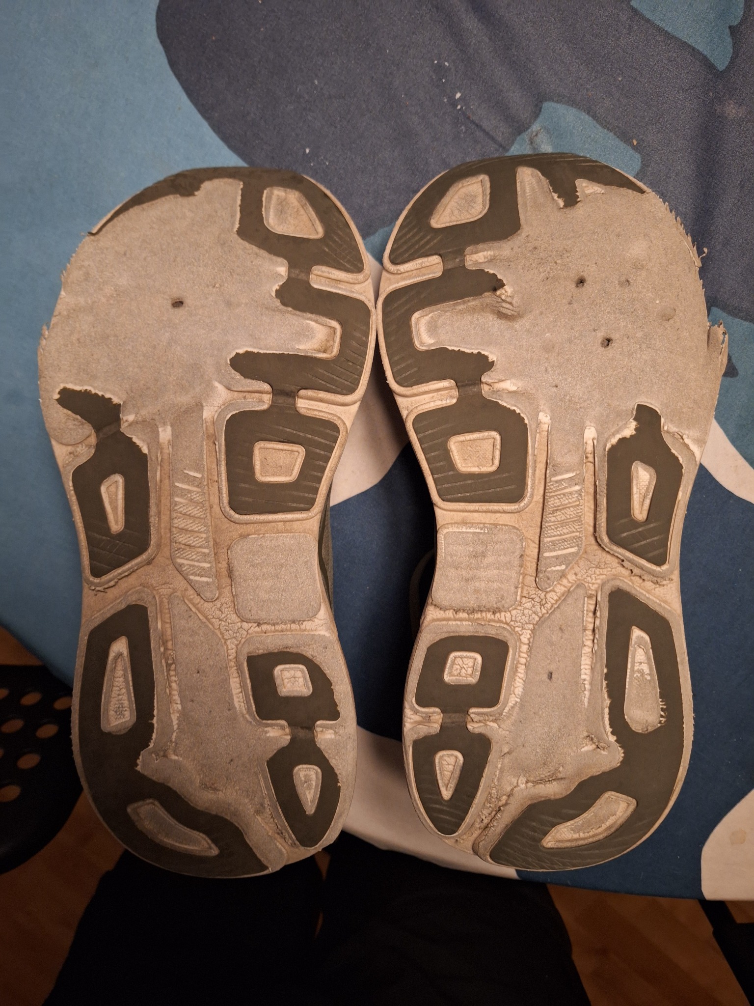 Kuten 31.7.2025 otetussa kuvassa näkyy, kengänpohjat olivat jo tuolloin kuluneet epätavallisesti ja ennenaikaisesti, vaikka käyttöä oli vasta noin puolet kokonaismäärästä. Tämä osoittaa, että kuluminen on alkanut poikkeuksellisen aikaisin eikä ole seurausta vääränlaisesta käytöstä, vaan todennäköisesti virheellisestä materiaalista tai valmistuserästä.