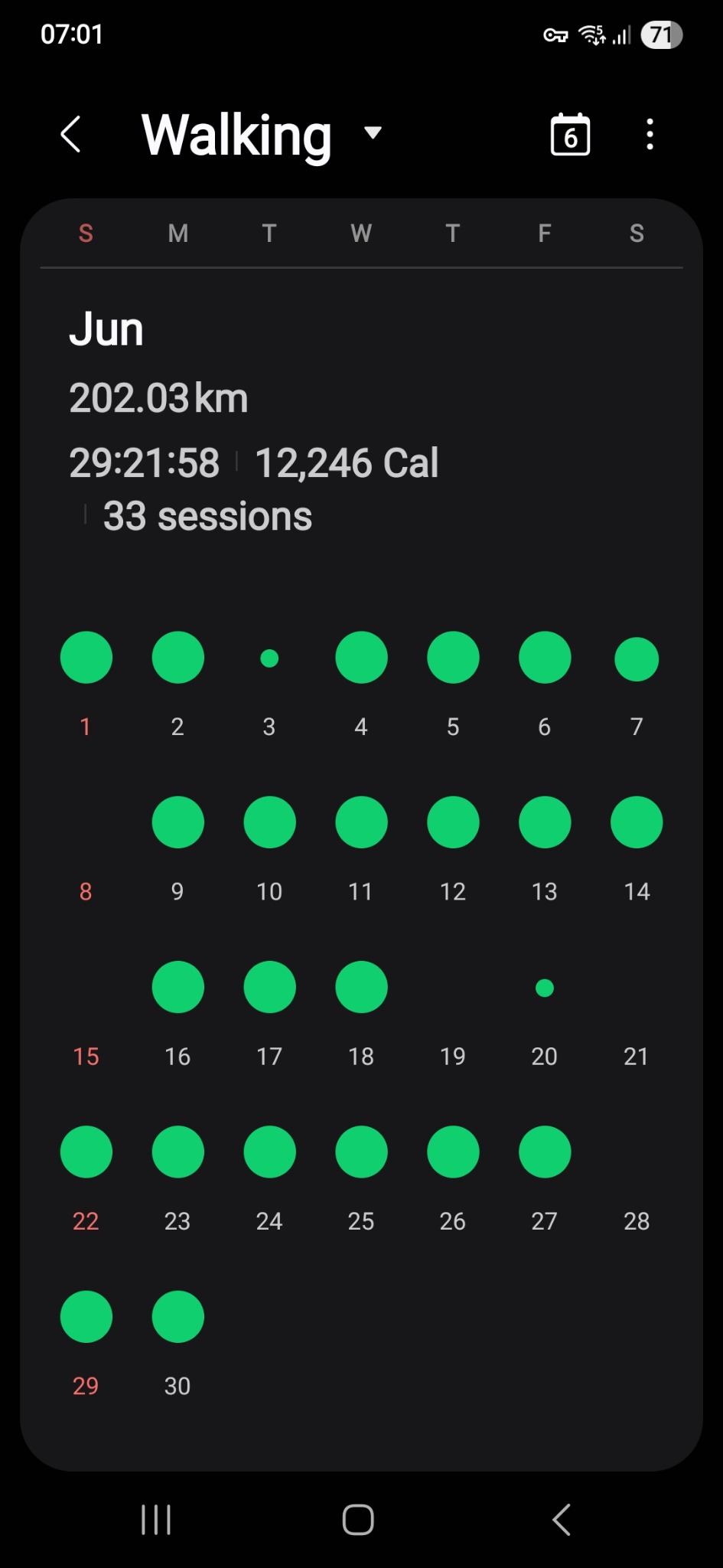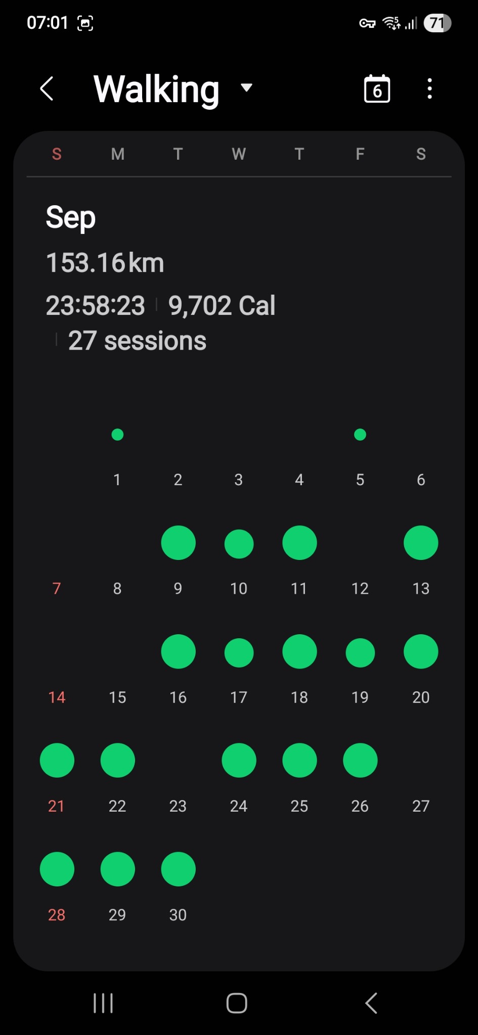 Käytän Samsung Watch FE -älykelloa ja Samsung Health -sovellusta, joka on automaattisesti tallentanut kaikki kävelyaktiviteettini ajalta 1.6.–30.9.2025.